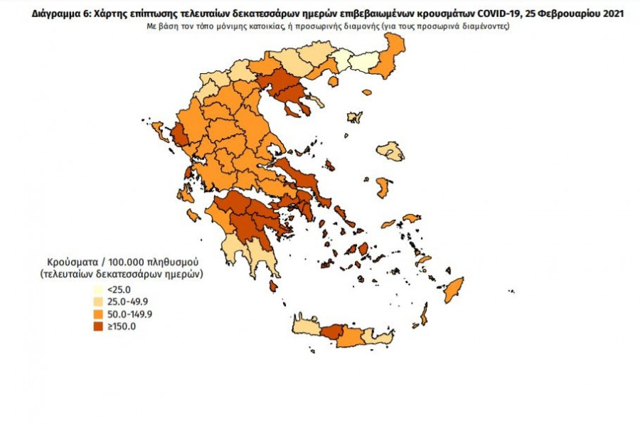 Η γεωγραφική κατανομή των 1.784 νέων κρουσμάτων Covid-19 που ανακοίνωσε την Πέμπτη (26/2) ο ΕΟΔΥ έχει ως εξής