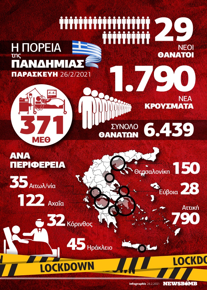 Κρούσματα σήμερα: 1.790 νέα ανακοίνωσε ο ΕΟΔΥ - 29 θάνατοι σε 24 ώρες, στους 371 οι διασωληνωμένοι