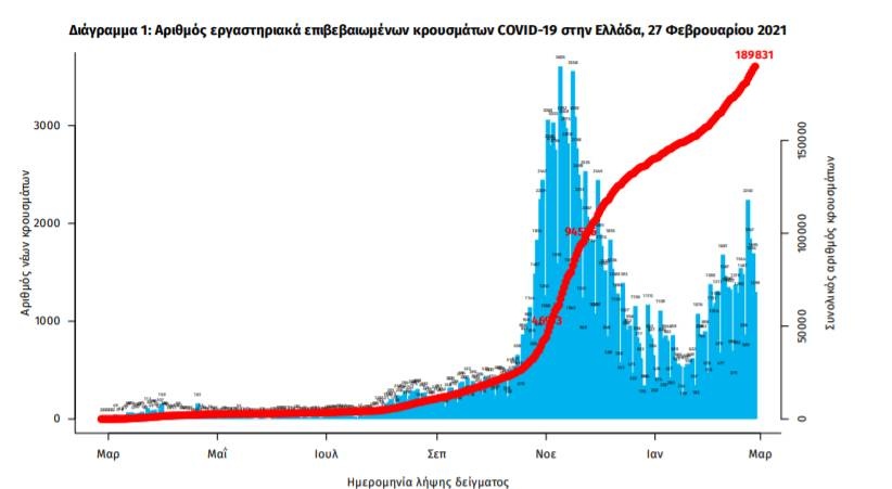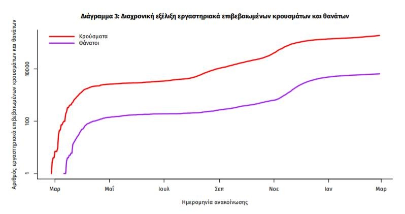 Η διαχρονική εξέλιξη των συνολικών κρουσμάτων και συνολικού αριθμού των θανάτων ασθενών COVID-19 παρουσιάζεται στο ακόλουθο διάγραμμα.