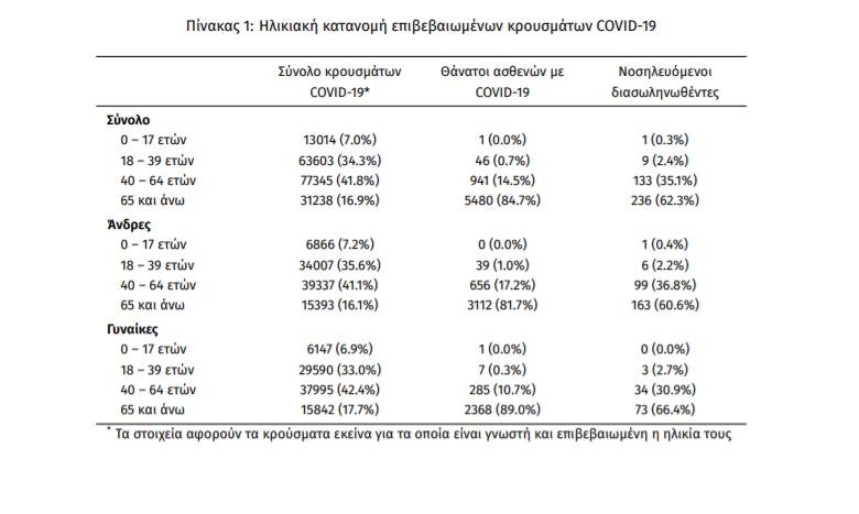 Hλικιακή κατανομή: Η διάμεση ηλικία των κρουσμάτων είναι 44 έτη (εύρος 0.2 έως 105 έτη), ενώ η διάμεση ηλικία των θανόντων είναι 79 έτη (εύρος 15 έως 103 έτη).