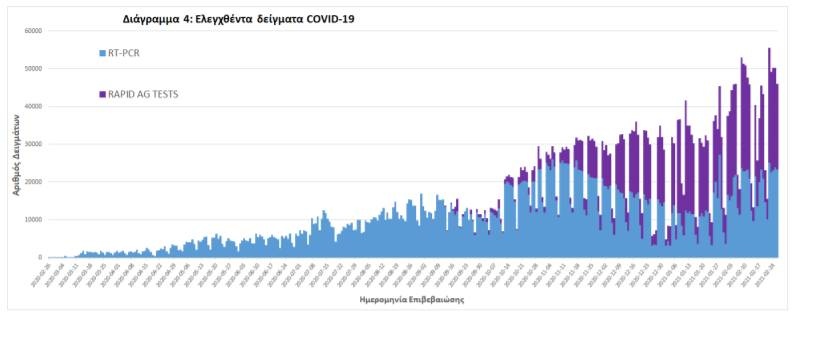 από Μονάδες Υγείας και Κλιμάκια του ΕΟΔΥ που διενεργούν ελέγχους Rapid Ag έχουν ελεγχθεί 1.577.701 δείγματα. O μέσος όρος του επταημέρου είναι 41.450 δειγματοληπτικοί έλεγχοι.