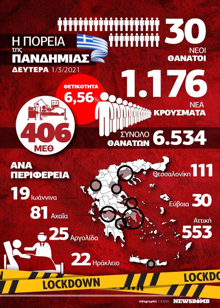 Οι νέοι θάνατοι ασθενών με COVID-19 είναι 30, ενώ από την έναρξη της επιδημίας έχουν καταγραφεί συνολικά 6.534 θάνατοι. Το 95.7% είχε υποκείμενο νόσημα ή/και ηλικία 70 ετών και άνω.