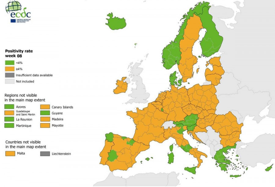 Όσον αφορά τον δείκτη θετικότητας, η χώρα μας παραμένει ολόκληρη στο «πράσινο», την ώρα που το μεγαλύτερο μέρος της Ευρώπης να παραμένει στο «κίτρινο». Αυτό σημαίνει ότι στο σύνολο της επικράτειας ο δείκτης θετικότητας βρίσκεται κάτω του ορίου συναγερμού του 4%, αντίθετα με την υπόλοιπη Ευρώπη όπου ο δείκτης είναι μεγαλύτερος από 4.