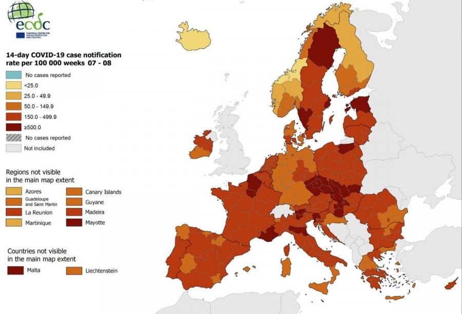 Υπενθυμίζεται ότι οι χάρτες του ECDC ανανεώνονται κάθε Πέμπτη, σύμφωνα με τη Σύσταση του Ευρωπαϊκού Συμβουλίου που έχει ως στόχο την εφαρμογή μιας συντονισμένης προσέγγισης μεταξύ των χωρών της ΕΕ όσον αφορά τον περιορισμό της ελεύθερης κυκλοφορίας για την αντιμετώπιση της πανδημίας.