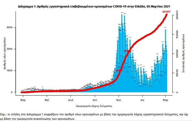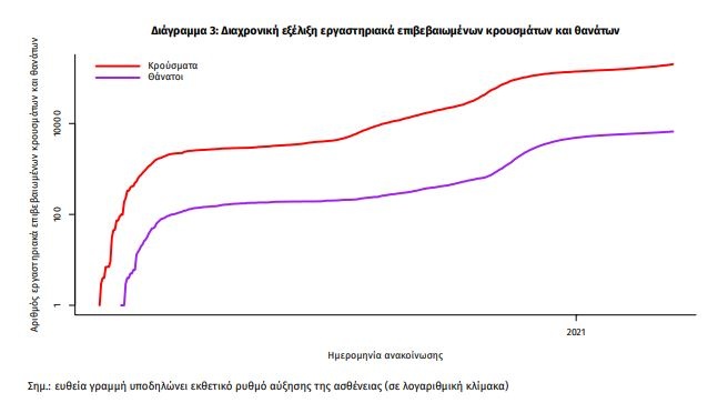 Η διαχρονική εξέλιξη των συνολικών κρουσμάτων και συνολικού αριθμού των θανάτων ασθενών COVID-19 παρουσιάζεται στο ακόλουθο διάγραμμα.