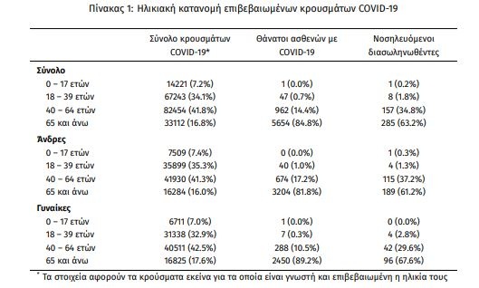 Hλικιακή κατανομή: Η διάμεση ηλικία των κρουσμάτων είναι 44 έτη (εύρος 0.2 έως 105 έτη), ενώ η διάμεση ηλικία των θανόντων είναι 79 έτη (εύρος 15 έως 103 έτη).