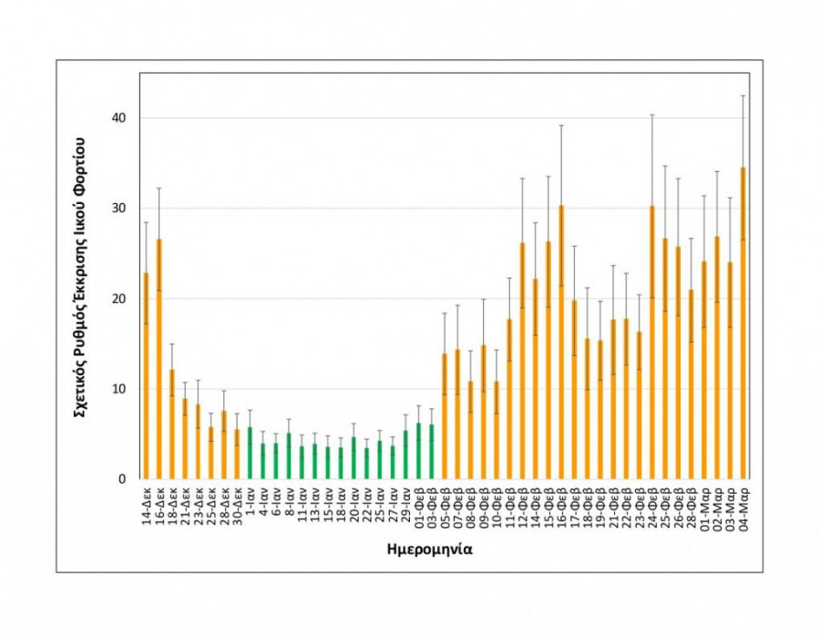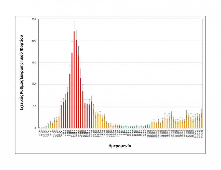 Όπως φαίνεται στα συνημμένα διαγράμματα που παρουσιάζει το ΑΠΕ-ΜΠΕ, οι εξορθολογισμένες τιμές σχετικής έκκρισης ιικού φορτίου των τελευταίων δύο ημερών είναι αντίστοιχες των τιμών που μετρήθηκαν στα τέλη Οκτωβρίου 2020, δηλαδή πριν την δραματική αύξηση του δεύτερου κύματος της πανδημίας.