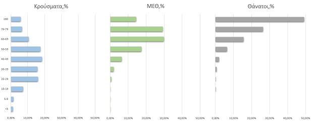 Ακολούθως παρουσιάζεται η ηλικιακή κατανομή των (α) συνολικών κρουσμάτων, (β) των περιστατικών που κατέληξαν σε θάνατο και (γ) των ασθενών που νοσηλεύονται διασωληνωμένοι: