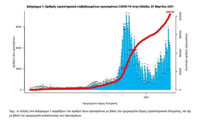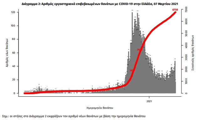 Η διαχρονική εξέλιξη των συνολικών κρουσμάτων και συνολικού αριθμού των θανάτων ασθενών COVID-19 παρουσιάζεται στο ακόλουθο διάγραμμα.