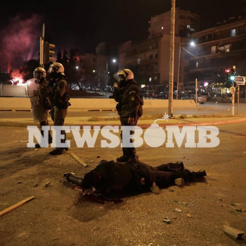 Σύμφωνα με τις εικόνες που προβλήθηκαν στο κεντρικό δελτίο ειδήσεων του ΑΝΤ1, διαδηλωτής ρίχνει τον αστυνομικό από τη μηχανή, την ώρα που άλλοι διαδηλωτές τρέχουν και του επιτίθενται, ενώ είναι πεσμένος στο έδαφος.
