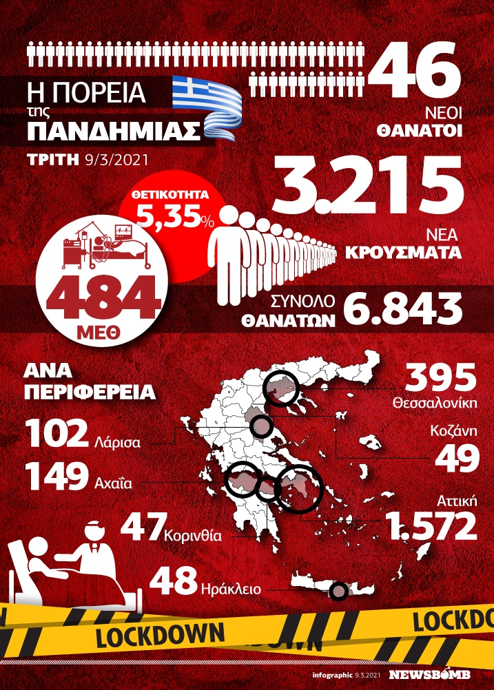 Πιο συγκεκριμένα, την Τρίτη (09.03) ανακοινώθηκαν 3.215 νέα κρούσματα κορονοϊού στην Ελλάδα. Οι θάνατοι ασθενών με COVID-19 μέσα σε ένα 24ωρο είναι 46, ενώ από την έναρξη της επιδημίας έχουν καταγραφεί συνολικά 6.843 θάνατοι. Το 95.8% είχε υποκείμενο νόσημα ή/και ηλικία 70 ετών και άνω.
