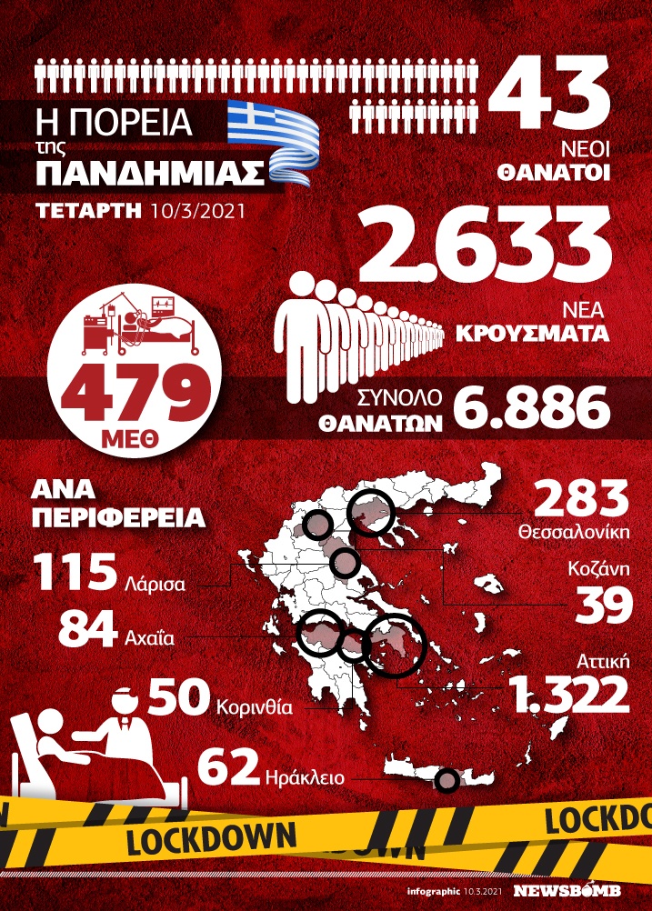 Σε ιδιαίτερα υψηλά επίπεδα συνεχίζουν να κινούνται τα νέα καθημερινά κρούσματα, με τον ΕΟΔΥ να ανακοινώνει για την Τετάρτη (10/3) 2.633 νέες μολύνσεις. Τα σημερινά κρούσματα είναι ελαφρώς μειωμένα από το χθεσινό αρνητικό ρεκόρ για το 2021, γεγονός που συνομολογεί ότι το άνοιγμα της αγοράς ή των κοινωνικών δραστηριοτήτων βρίσκεται αρκετά μακριά.