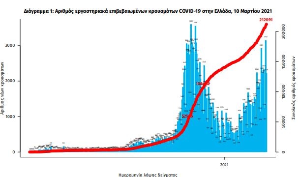 Κορονοϊός - Όλες οι ειδήσεις: Την Τετάρτη, 10 Μαρτίου 2021, ο ΕΟΔΥ ανακοίνωσε 2.633 νέα κρούσματα του νέου ιού στη χώρα, εκ των οποίων τα επτά εντοπίστηκαν κατόπιν ελέγχων στις πύλες εισόδου της χώρας.