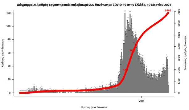 Οι νέοι θάνατοι ασθενών με COVID-19 είναι 43, ενώ από την έναρξη της επιδημίας έχουν καταγραφεί συνολικά 6.886 θάνατοι. Το 95,8% είχε υποκείμενο νόσημα ή/και ηλικία 70 ετών και άνω.