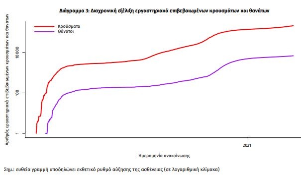 Η διαχρονική εξέλιξη των συνολικών κρουσμάτων και συνολικού αριθμού των θανάτων ασθενών COVID-19 παρουσιάζεται στο ακόλουθο διάγραμμα.
