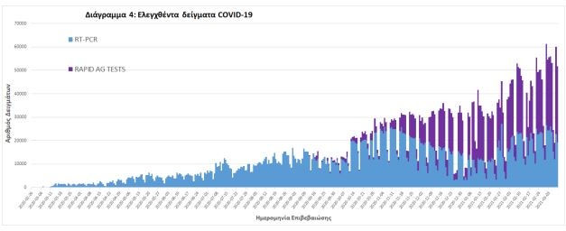 Από την 1η Ιανουαρίου 2020 μέχρι σήμερα, στα εργαστήρια που διενεργούν ελέγχους για τον νέο κορoνοϊό (SARS-CoV-2) και που δηλώνουν συστηματικά το σύνολο των δειγμάτων που ελέγχουν, έχουν συνολικά ελεγχθεί 3.855.184 κλινικά δείγματα ενώ από Μονάδες Υγείας και Κλιμάκια του ΕΟΔΥ που διενεργούν ελέγχους Rapid Ag έχουν ελεγχθεί 1.834.637 δείγματα.