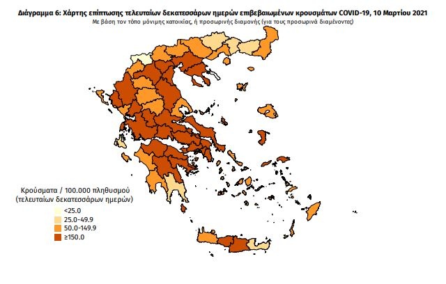 Ημερήσιος αριθμός και κρούσματα ανά 100.000 πληθυσμού επιβεβαιωμένων εγχώριων κρουσμάτων COVID-19 ανά περιφερειακή ενότητα στις 10 Μαρτίου 2021.