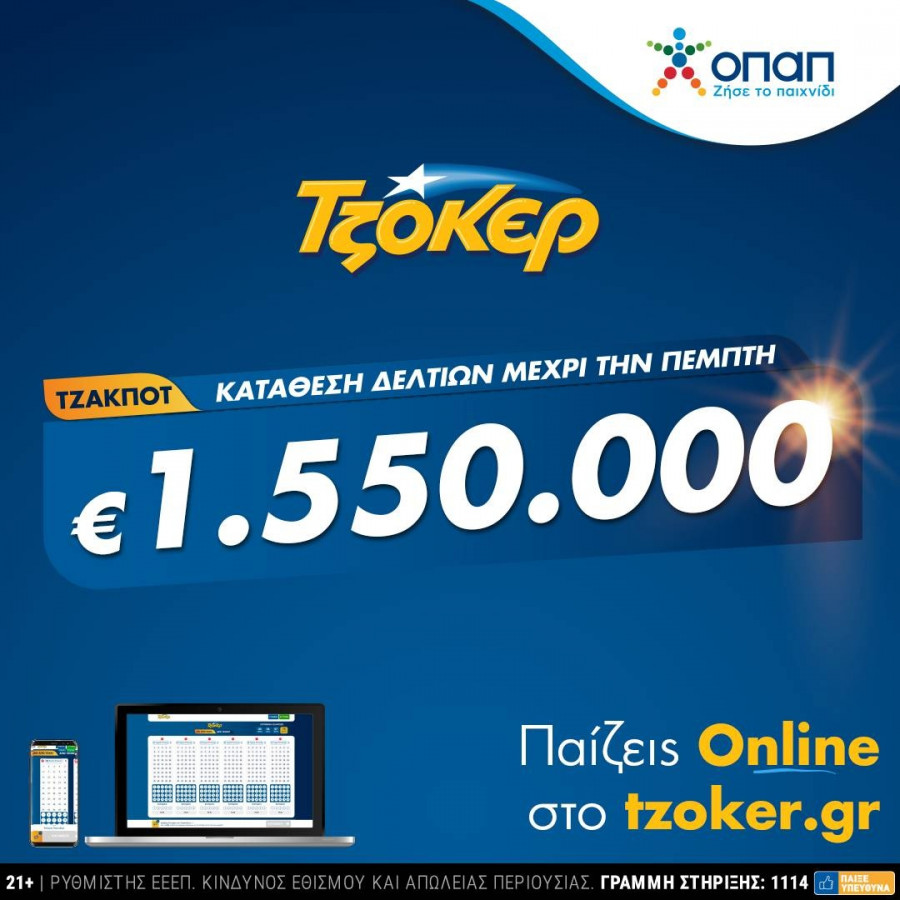 Το τζακ ποτ στην κλήρωση της περασμένης Τρίτης ανέβασε το ποσό που μοιράζει απόψε η πρώτη κατηγορία του ΤΖΟΚΕΡ σε 1.550.000 ευρώ. Ο νικητής ή οι νικητές που θα κερδίσουν το μεγάλο έπαθλο του παιχνιδιού, θα αναδειχθούν μέσω της κλήρωσης που θα πραγματοποιηθεί στις 22:00, εφόσον δεν σημειωθεί νέο τζακ ποτ.