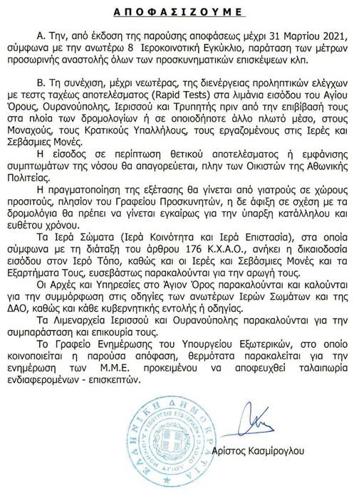 «Με απόφαση του Αναπληρωτή Διοικητή του Αγίου Όρους παρατείνεται μέχρι 31 Μαρτίου 2021 η αναστολή όλων των προσκυνηματικών επισκέψεων και επιβάλλεται η διενέργεια προληπτικών ελέγχων στα λιμάνια εισόδου του Αγίου Όρους σε οποιονδήποτε επιθυμεί να εισέλθει στον Ιερό Τόπο», αναφέρεται στην ανακοίνωση.