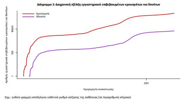 Η διαχρονική εξέλιξη των συνολικών κρουσμάτων και συνολικού αριθμού των θανάτων ασθενών COVID-19 παρουσιάζεται στο ακόλουθο διάγραμμα.