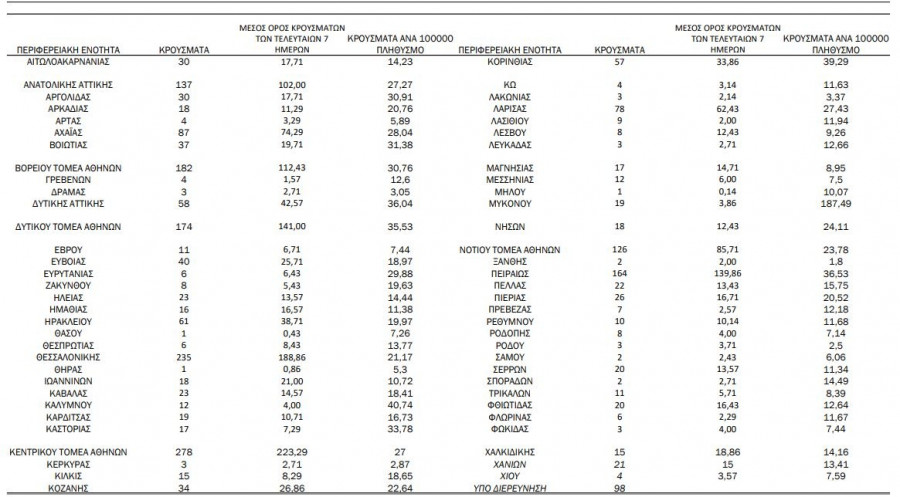 Κατανομή ανακοινωθέντων εγχώριων κρουσμάτων: Από το σύνολο των 2.405 νέων κρουσμάτων του νέου ιού στη χώρα 15 είναι εισαγόμενα εκ των οποίων 14 εντοπίστηκαν κατόπιν ελέγχων στις πύλες εισόδου της χώρας. Η κατανομή των 2.390 νέων εγχώριων κρουσμάτων ανά Περιφερειακή Ενότητα παρουσιάζεται στον κατωτέρω πίνακα.3