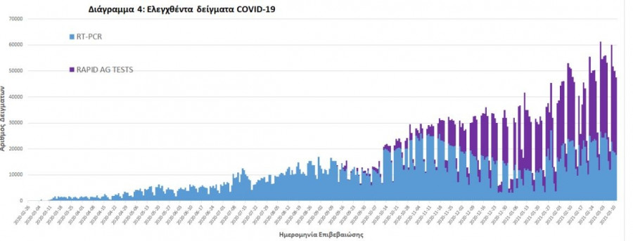Δείγματα που έχουν ελεγχθεί: Από την 1η Ιανουαρίου 2020 μέχρι σήμερα, στα εργαστήρια που διενεργούν ελέγχους για τον νέο κορωνοϊό (SARS-CoV-2) και που δηλώνουν συστηματικά το σύνολο των δειγμάτων που ελέγχουν, έχουν συνολικά ελεγχθεί 3.891.671 κλινικά δείγματα εν από Μονάδες Υγείας και Κλιμάκια του ΕΟΔΥ που διενεργούν ελέγχους Rapid Ag έχουν ελεγχθεί 1.895.785 δείγματα. O μέσος όρος του επταημέρου είναι 43.727 δειγματοληπτικοί έλεγχοι.