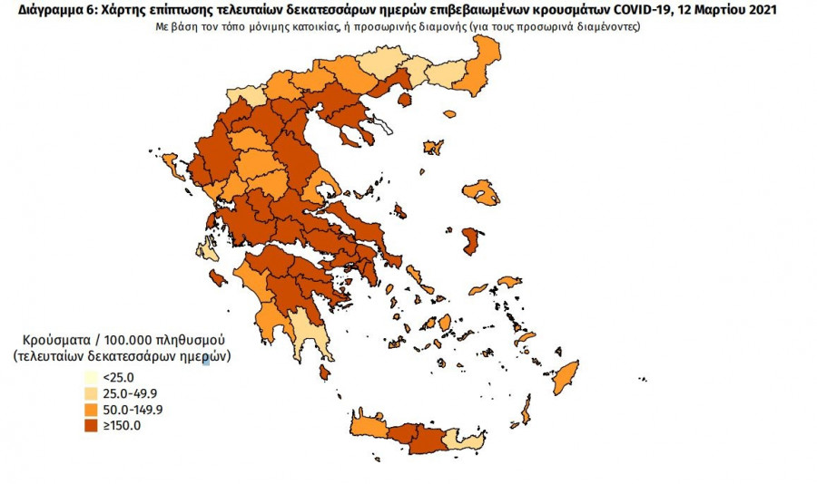Γεωγραφική διασπορά: Ο χάρτης αποτυπώνει τη γεωγραφική κατανομή των συνολικών κρουσμάτων COVID-19 (από την αρχή της επιδημίας) ανά Περιφερειακή Ενότητα της χώρας, με βάση την δηλωθείσα διεύθυνση μόνιμης κατοικίας του ασθενούς, ή τη διεύθυνση προσωρινής διαμονής για τους τουρίστες και άλλους προσωρινά διαμένοντες στην Ελλάδα. Συμπεριλαμβάνονται τόσο κρούσματα με ιστορικό ταξιδίου (“εισαγόμενα”) όσο και κρούσματα με πιθανή εγχώρια μετάδοση.