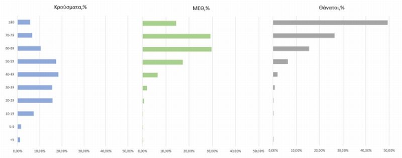 Ακολούθως παρουσιάζεται η ηλικιακή κατανομή των (α) συνολικών κρουσμάτων, (β) των περιστατικών που κατέληξαν σε θάνατο και (γ) των