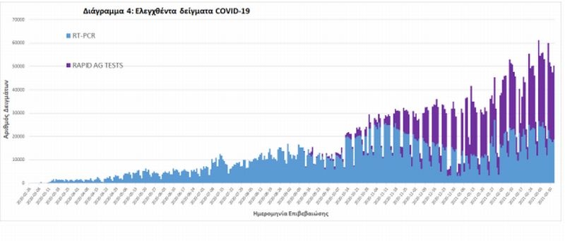 Από την 1η Ιανουαρίου 2020 μέχρι σήμερα, στα εργαστήρια που διενεργούν ελέγχους για τον νέο κορονοϊό (SARS-CoV-2) και που δηλώνουν συστηματικά το σύνολο των δειγμάτων που ελέγχουν, έχουν συνολικά ελεγχθεί 3.910.466 κλινικά δείγματα ενώ από Μονάδες Υγείας και Κλιμάκια του ΕΟΔΥ που διενεργούν ελέγχους Rapid Ag έχουν ελεγχθεί 1.927.329 δείγματα. O μέσος όρος του επταημέρου είναι 43.331 δειγματοληπτικοί έλεγχοι.
