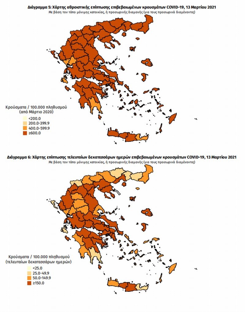 Ημερήσιος αριθμός και κρούσματα ανά 100.000 πληθυσμού επιβεβαιωμένων εγχώριων κρουσμάτων COVID-19 ανά περιφερειακή ενότητα στις 13 Μαρτίου 2021.