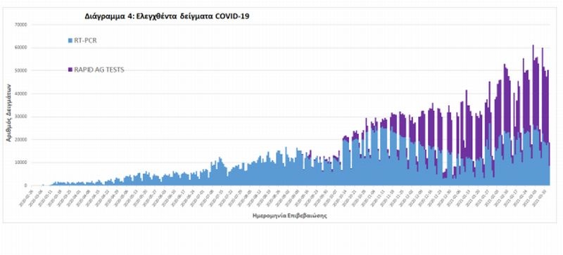 Από την 1η Ιανουαρίου 2020 μέχρι σήμερα, στα εργαστήρια που διενεργούν ελέγχους για τον νέο κορονοϊό (SARS-CoV-2) και που δηλώνουν συστηματικά το σύνολο των δειγμάτων που ελέγχουν, έχουν συνολικά ελεγχθεί 3.919.045 κλινικά δείγματα ενώ από Μονάδες Υγείας και Κλιμάκια του ΕΟΔΥ που διενεργούν ελέγχους Rapid Ag έχουν ελεγχθεί 1.937.573 δείγματα. O μέσος όρος του επταημέρου είναι 42.520 δειγματοληπτικοί έλεγχοι.