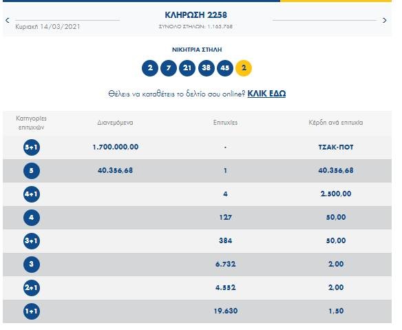 Οι τυχεροί αριθμοί που έβγαλε η κληρωτίδα της αποψινής κλήρωσης είναι οι: 2, 7, 21, 38, 45 και Τζόκερ ο αριθμός 2.