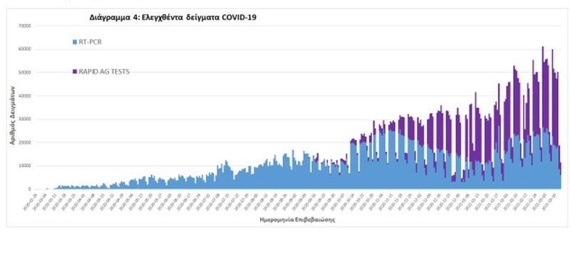 Από την 1η Ιανουαρίου 2020 μέχρι σήμερα, στα εργαστήρια που διενεργούν ελέγχους για τον νέο κορονοϊό (SARS-CoV-2) και που δηλώνουν συστηματικά το σύνολο των δειγμάτων που ελέγχουν, έχουν συνολικά ελεγχθεί 3.925.165 κλινικά δείγματα ενώ από Μονάδες Υγείας και Κλιμάκια του ΕΟΔΥ που διενεργούν ελέγχους Rapid Ag έχουν ελεγχθεί 1.943.167 δείγματα. O μέσος όρος του επταημέρου είναι 41.476 δειγματοληπτικοί έλεγχοι.