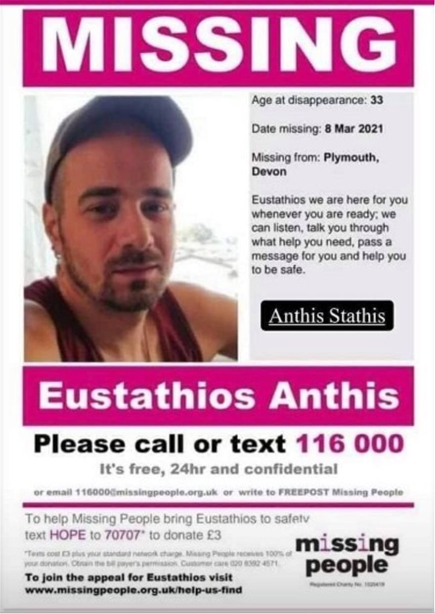 Ο Ευστάθιος Άνθης για τελευταία φορά εμφανίστηκε στις 5 π.μ. τη Δευτέρα 8 Μαρτίου στο Burgh Island Hotel στο Bigbury-on-Sea.