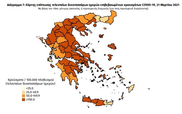 Πίνακας 2: Ημερήσιος αριθμός και κρούσματα ανά 100.000 πληθυσμού επιβεβαιωμένων εγχώριων κρουσμάτων COVID-19 ανά περιφερειακή ενότητα στις 21 Μαρτίου 2021.
