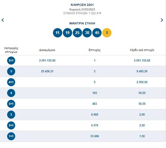Από την κλήρωση της Κυριακής (21/03) αναδείχθηκε ένας μεγάλος υπερτυχερός που κέρδισε 2.091.155,68 ευρώ στην πρώτη κατηγορία (5+1), καθώς και 3 τυχεροί στη δεύτερη κατηγορία (5αρια) που κέρδισαν συνολικά 25.456,51 ευρώ.