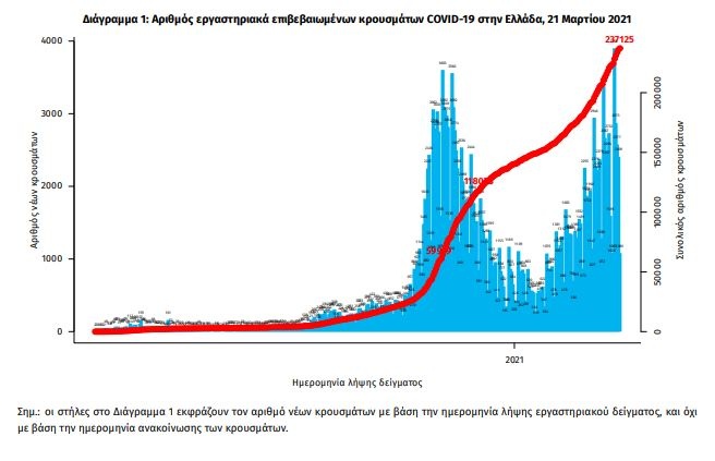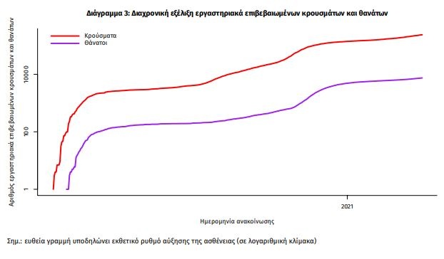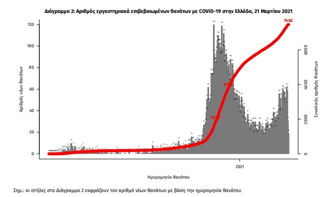 Η διαχρονική εξέλιξη των συνολικών κρουσμάτων και συνολικού αριθμού των θανάτων ασθενών COVID-19 παρουσιάζεται στο ακόλουθο διάγραμμα.