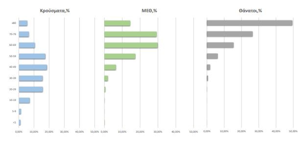 Διάγραμμα 4: Ηλικιακή Κατανομή κρουσμάτων, νοσηλευόμενων στις MEΘ και ασθενών που απεβίωσαν από την αρχή της πανδημίας