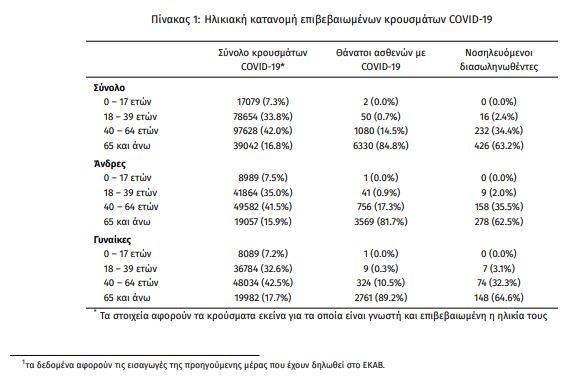 Οι νέοι θάνατοι ασθενών με COVID-19 είναι 41, ενώ από την έναρξη της επιδημίας έχουν καταγραφεί συνολικά 7.462 θάνατοι. Το 95.9% είχε υποκείμενο νόσημα ή/και ηλικία 70 ετών και άνω.