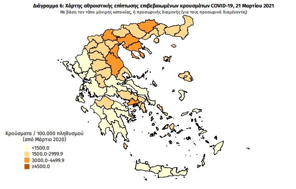 Ο χάρτης αποτυπώνει τη γεωγραφική κατανομή των συνολικών κρουσμάτων COVID-19 (από την αρχή της επιδημίας) ανά Περιφερειακή Ενότητα της χώρας, με βάση την δηλωθείσα διεύθυνση μόνιμης κατοικίας του ασθενούς, ή τη διεύθυνση προσωρινής διαμονής για τους τουρίστες και άλλους προσωρινά διαμένοντες στην Ελλάδα.