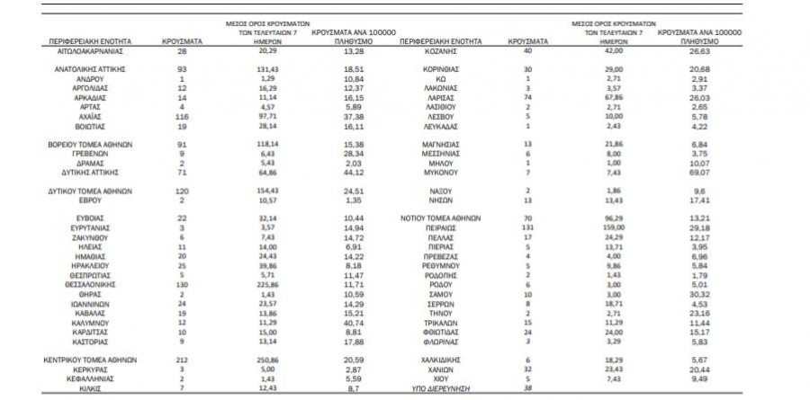 Κατανομή ανακοινωθέντων εγχώριων κρουσμάτων: Από το σύνολο των 1.707 νέων κρουσμάτων του νέου ιού στη χώρα 22 είναι εισαγόμενα εκ των οποίων 21 εντοπίστηκαν κατόπιν ελέγχων στις πύλες εισόδου της χώρας. Η κατανομή των 1.685 νέων εγχώριων κρουσμάτων ανά Περιφερειακή Ενότητα παρουσιάζεται στον κατωτέρω πίνακα.