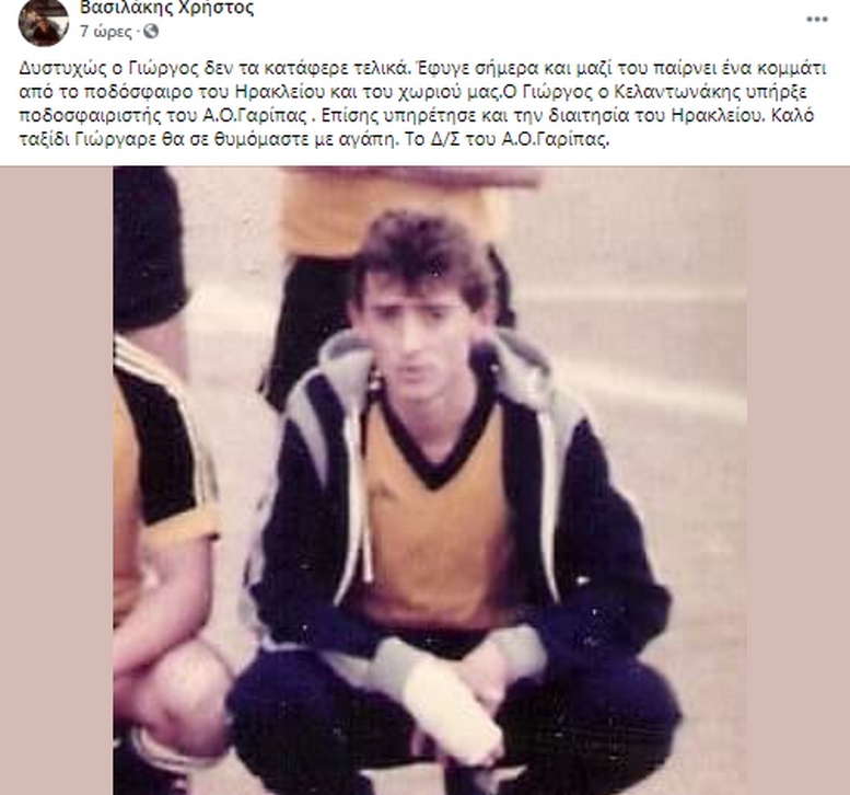 «Δυστυχώς ο Γιώργος δεν τα κατάφερε τελικά. Έφυγε σήμερα και μαζί του παίρνει ένα κομμάτι από το ποδόσφαιρο του Ηρακλείου και του χωριού μας. Ο Γιώργος ο Κελαντωνάκης υπήρξε ποδοσφαιριστής του Α.Ο.Γαρίπας. Επίσης υπηρέτησε και την διαιτησία του Ηρακλείου. Καλό ταξίδι Γιώργαρε θα σε θυμόμαστε με αγάπη. Το Δ/Σ του Α.Ο.Γαρίπας»