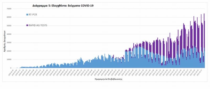 Από την 1η Ιανουαρίου 2020 μέχρι σήμερα, στα εργαστήρια που διενεργούν ελέγχους για τον νέο κορoνοϊό (SARS-CoV-2) και που δηλώνουν συστηματικά το σύνολο των δειγμάτων που ελέγχουν, έχουν συνολικά ελεγχθεί 4.071.496 κλινικά δείγματα ενώ από Μονάδες Υγείας και Κλιμάκια του ΕΟΔΥ που διενεργούν ελέγχους Rapid Ag έχουν ελεγχθεί 2.182.858 δείγματα. O μέσος όρος του επταημέρου είναι 44.273 δειγματοληπτικοί έλεγχοι.