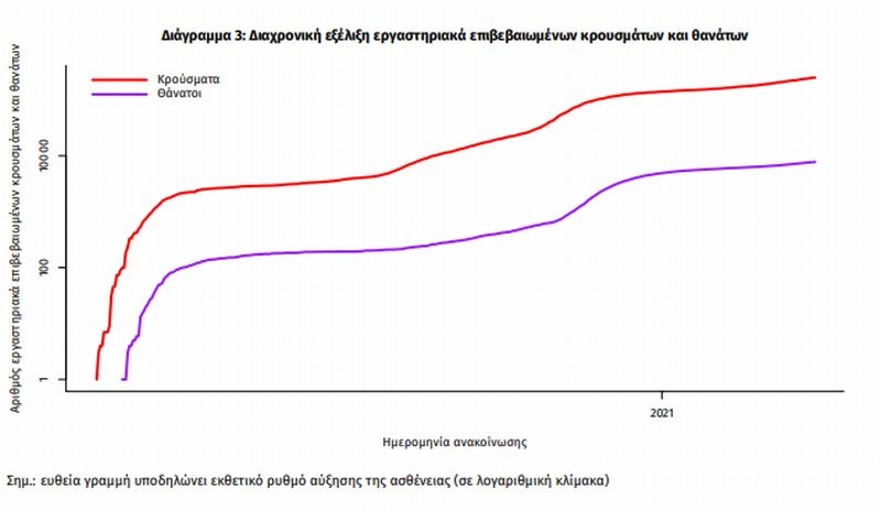 Η διαχρονική εξέλιξη των συνολικών κρουσμάτων και συνολικού αριθμού των θανάτων ασθενών COVID-19 παρουσιάζεται στο ακόλουθο διάγραμμα