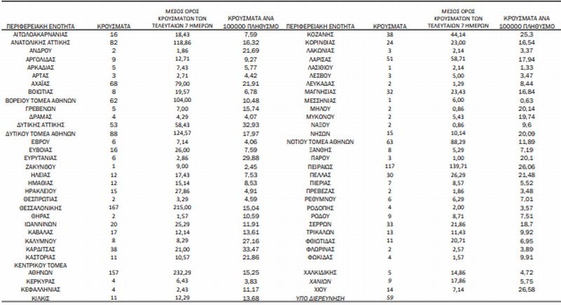 Από το σύνολο των 1.496 νέων κρουσμάτων του νέου ιού στη χώρα 7 είναι εισαγόμενα εκ των οποίων 5 εντοπίστηκαν κατόπιν ελέγχων στις πύλες εισόδου της χώρας. Η κατανομή των 1.489 νέων εγχώριων κρουσμάτων ανά Περιφερειακή Ενότητα παρουσιάζεται στον κατωτέρω πίνακα.