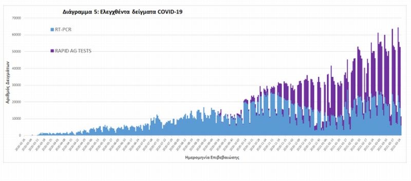 Από την 1η Ιανουαρίου 2020 μέχρι σήμερα, στα εργαστήρια που διενεργούν ελέγχους για τον νέο κορονοϊό (SARS-CoV-2) και που δηλώνουν συστηματικά το σύνολο των δειγμάτων που ελέγχουν, έχουν συνολικά ελεγχθεί 4.093.890 κλινικά δείγματα ενώ από Μονάδες Υγείας και Κλιμάκια του ΕΟΔΥ που διενεργούν ελέγχους Rapid Ag έχουν ελεγχθεί 2.224.899 δείγματα. O μέσος όρος του επταημέρου είναι 38.270 δειγματοληπτικοί έλεγχοι.