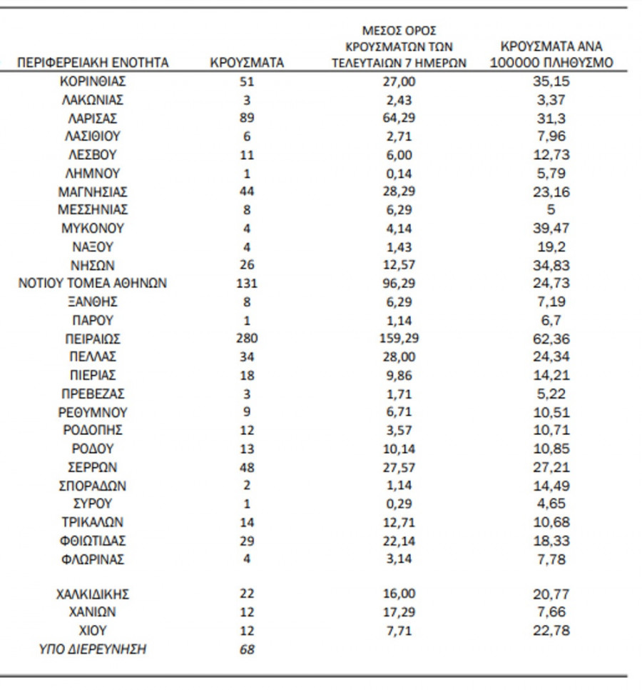 Από το σύνολο των 3.133 νέων κρουσμάτων του νέου ιού στη χώρα 9 είναι εισαγόμενα εκ των οποίων 6 εντοπίστηκαν κατόπιν ελέγχων στις πύλες εισόδου της χώρας. Η κατανομή των 3.124 νέων εγχώριων κρουσμάτων ανά Περιφερειακή Ενότητα παρουσιάζεται στον κατωτέρω πίνακα.