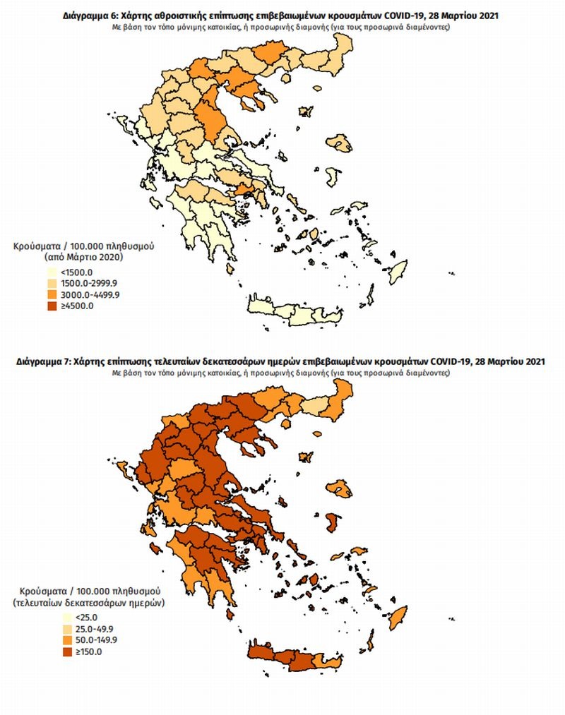 Ημερήσιος αριθμός και κρούσματα ανά 100.000 πληθυσμού επιβεβαιωμένων εγχώριων κρουσμάτων COVID-19 ανά περιφερειακή ενότητα στις 28 Μαρτίου 2021