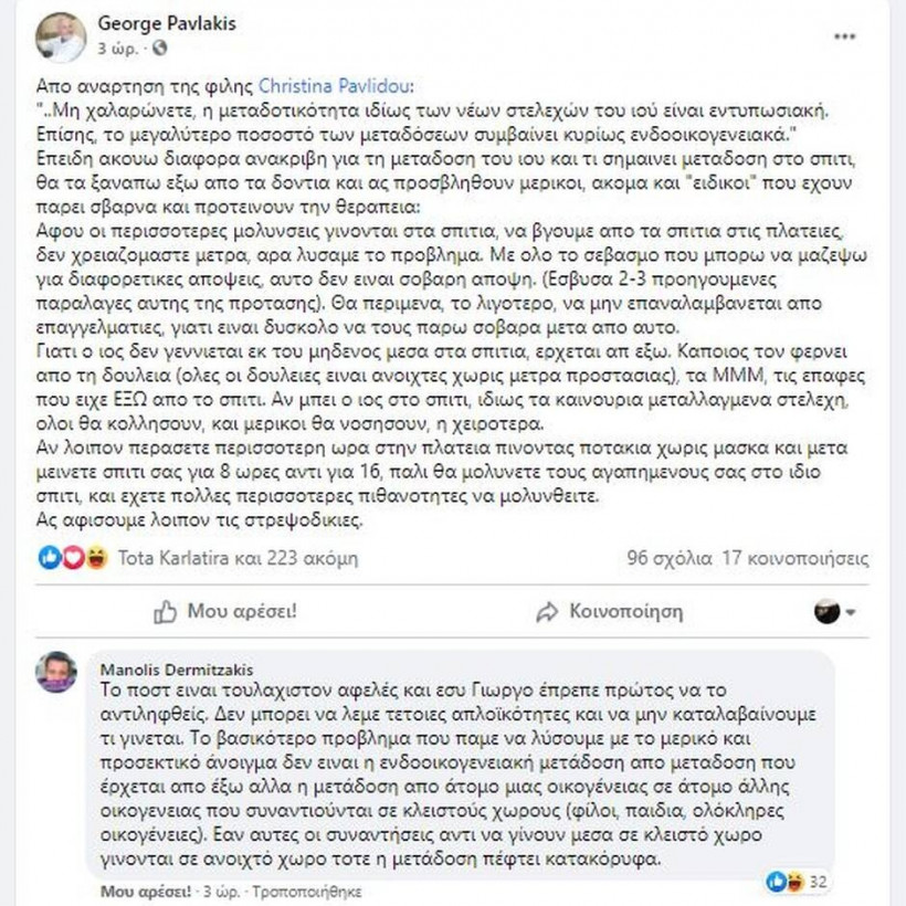 «Το ποστ είναι τουλάχιστον αφελές και εσύ Γιώργο έπρεπε πρώτος να το αντιληφθείς. Δεν μπορεί να λεμέ τέτοιες απλοϊκότητες και να μην καταλαβαίνουμε τι γίνεται. Το βασικότερο πρόβλημα που πάμε να λύσουμε με το μερικό και προσεκτικό άνοιγμα δεν είναι η ενδοοικογενειακή μετάδοση από μετάδοση που έρχεται από έξω αλλά η μετάδοση από άτομο μιας οικογένειας σε άτομο άλλης οικογένειας που συναντιούνται σε κλειστούς χώρους (φίλοι, παιδιά, ολόκληρες οικογένειες)» απάντησε ο Μανώλης Δερμιτζάκης.