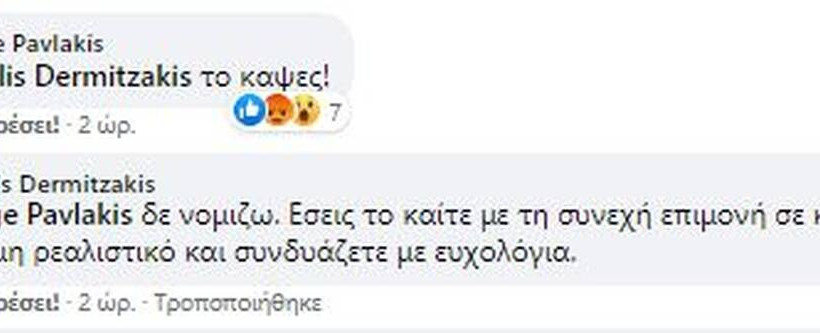 Ακολούθησε «διάλογος» του Μανώλη Δερμιτζάκη με άλλους σχολιαστές της ανάρτησης Παυλάκη με τον γιατρό από τις ΗΠΑ να παρεμβαίνει κάποια στιγμή και να σχολιάζει: «το 'καψες».